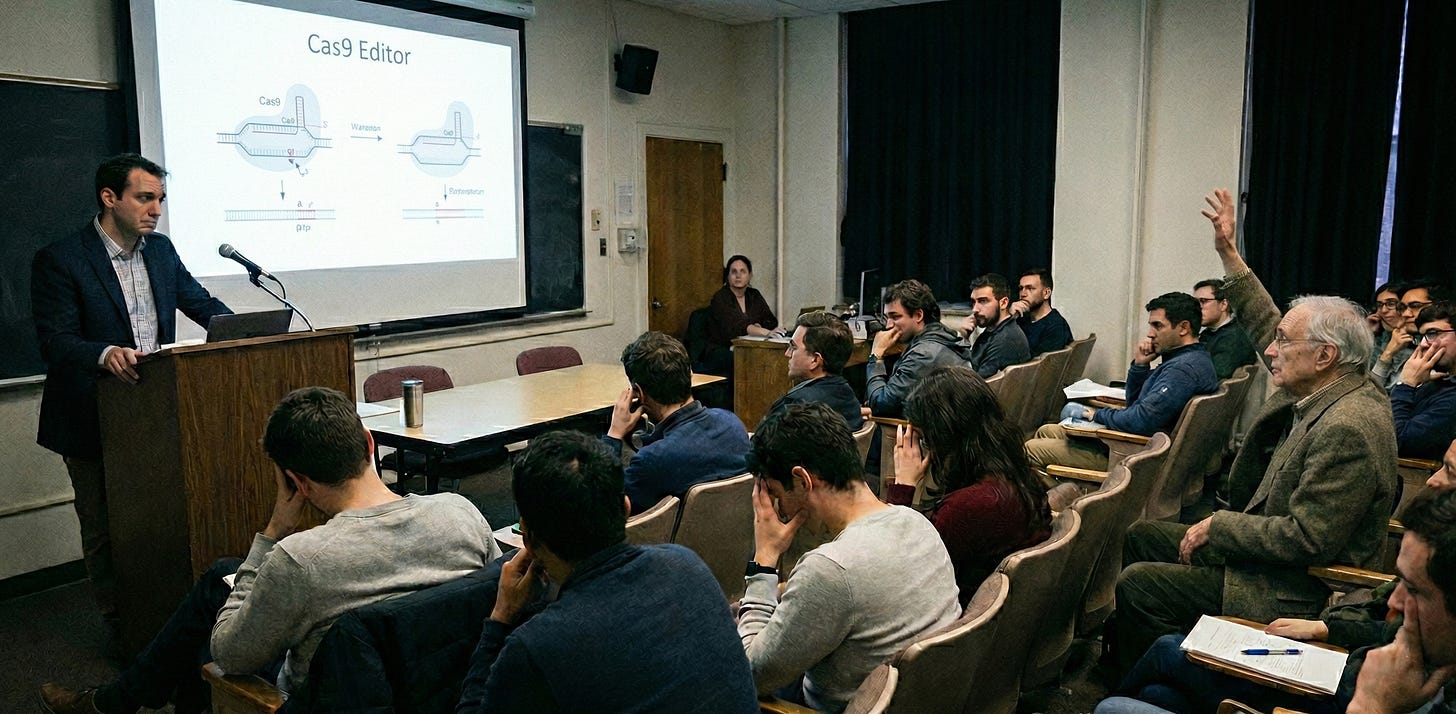 The talk was about a new prime editing strategy that could theoretically cure thousands of devastating genetic diseases. The room had been enjoying the possibility of hope. The hope was now gone.